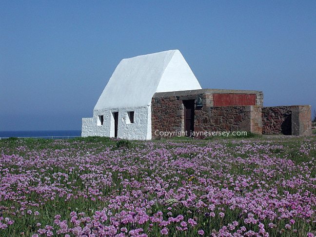 Moving further north along the bay is this lovely little white 'house' perched on the edge of the sea wall. This is 'Le Don Hilton' - an old guard house dating back to the seventeenth century. The guardhouse is now under the protection of the National Trust. |