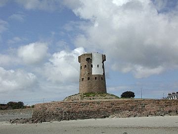 Above left is the martello tower at Le Hocq (1780), standing in a grassy area by the edge of the main coast road. The picture above right is taken standing beneath the tower on Le Hocq beach - you can see the huge area of rock and sand exposed at low water, stretching far into the distance. People visit the La Rocque / Le Hocq area of the island to view the scenery, sit on the beach and potter around rock pools. Food concessions are usually limited to one ice cream van. |