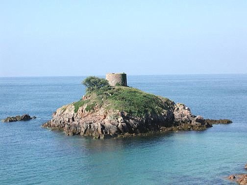 Pictured above is Janvrin's Tomb, which sits on a small islet, accessible at low water, and usually forms the focal point of postcards of the bay. There is a sad story attached to this island: The tower that you see here was built as a defense against French attack during the 1800s but it stands above the tomb of a sailor called Philip Janvrin. On returning to the island from a trip to Nantes in the year 1721, Janvrin and his crew were not allowed to land, for fear that they might be infected with the plague that was afflicting the people of that area of France. They were ordered to stay in quarantine on their ship in the nearby Belcroute Bay. It's not known whether the crew were actually suffering from the plague, but sadly poor Janvrin died and his widow was still not allowed to bring his body ashore. Permission was finally given for his body to be interred on 'Ile au Guerdain' (the little island you see above), so that he would be within sight of his St. Brelade home. |